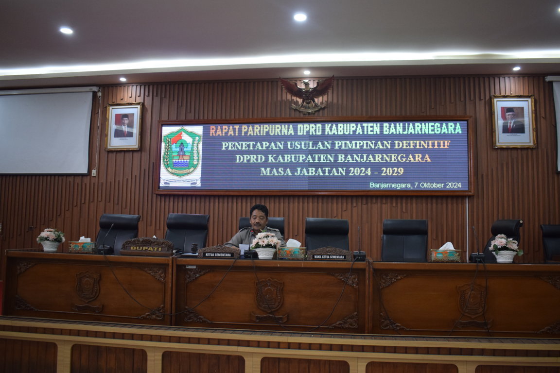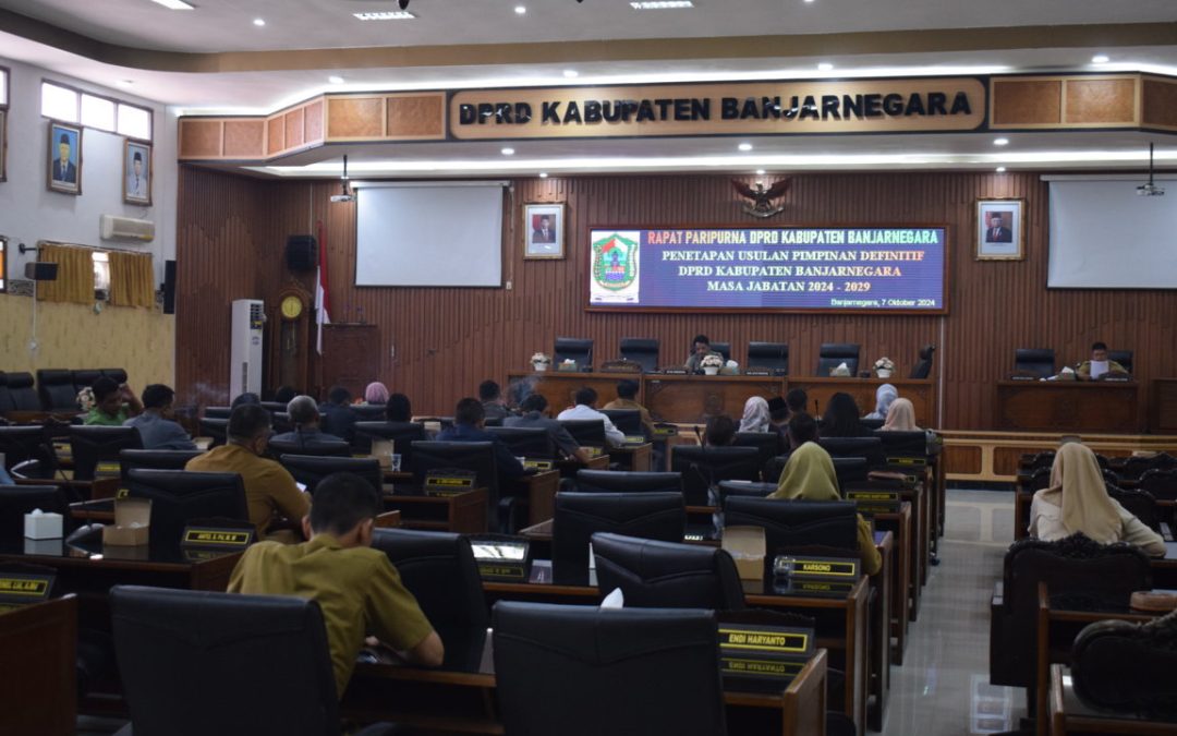 Humas.DPRD – Senin, 7 Oktober 2024 DPRD Kabupaten Banjarnegara menyelenggarakan Rapat Paripurna dengan agenda Penetapan Usulan Calon Pimpinan Definitif DPRD Kabupaten Banjarnegara masa jabatan 2024-2029. Rapat ini dipimpin oleh Ketua Sementara DPRD Slamet.