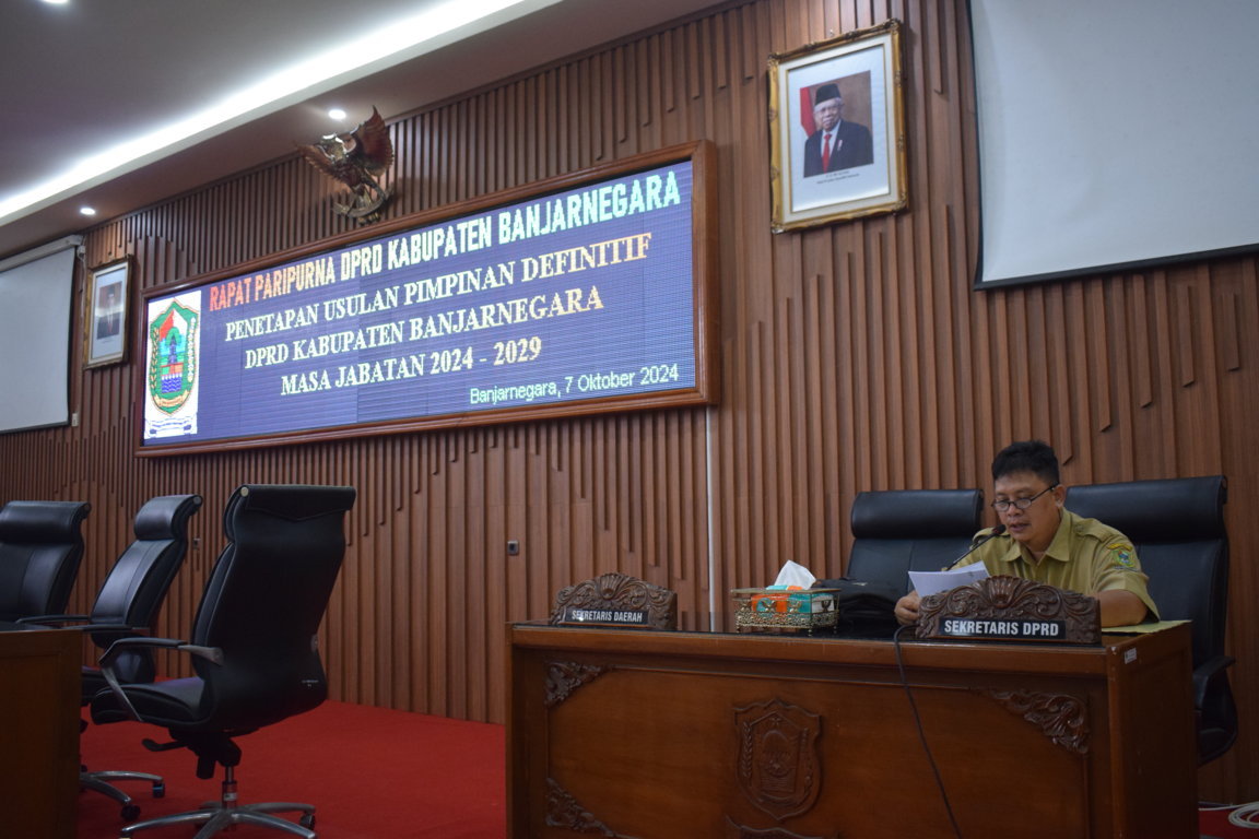 Berdasarkan Pasal 165 ayat (4) Undang-undang Nomor 23 tahun 2014 dijelaskan bahwa Ketua dan Wakil Ketua DPRD Kabupaten/ Kota diresmikan dengan Keputusan Gubernur sebagai Wakil Pemerintah Pusat. Sesuai dengan ketentuan tersebut DPRD Kabupaten Banjarnegara melalui keputusan Pimpinan DPRD Kabupaten Banjarnegara Nomor 27 Tahun 2024 tentang Penetapan Calon Pimpinan Definitif DPRD Kabupaten Banjarnegara Masa Jabatan 2024-2029 memutuskan menetapkan Calon Pimpinan Definitif DPRD Kabupaten Banjarnegara Masa Jabatan 2024-2029 sebagai berikut :